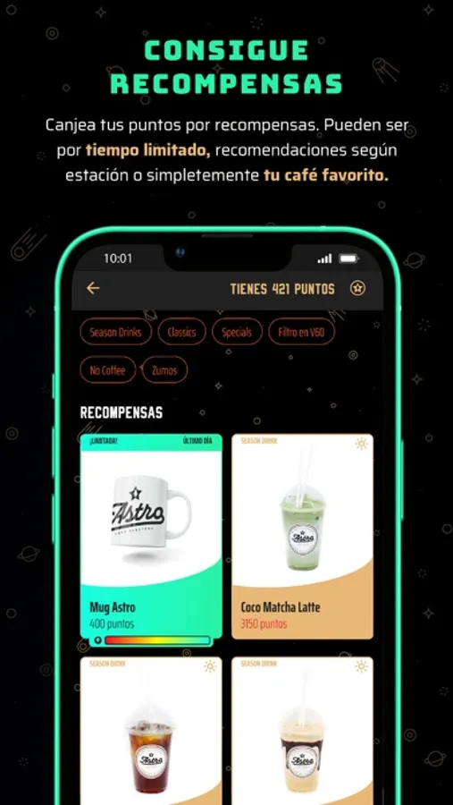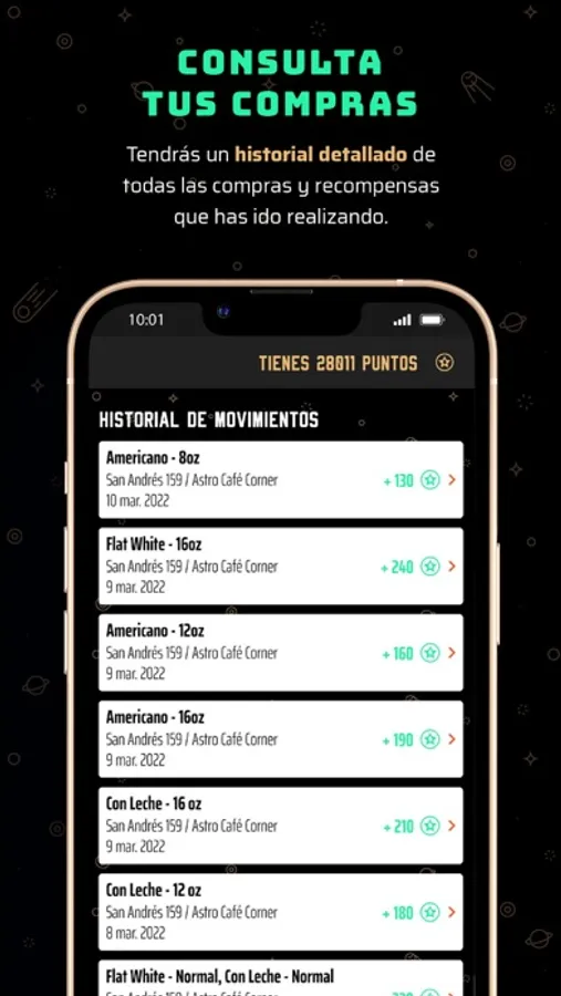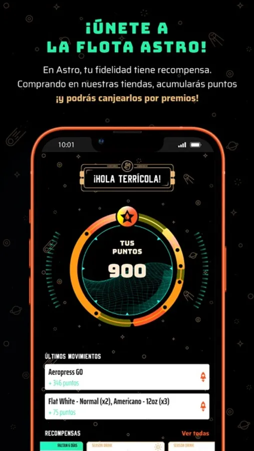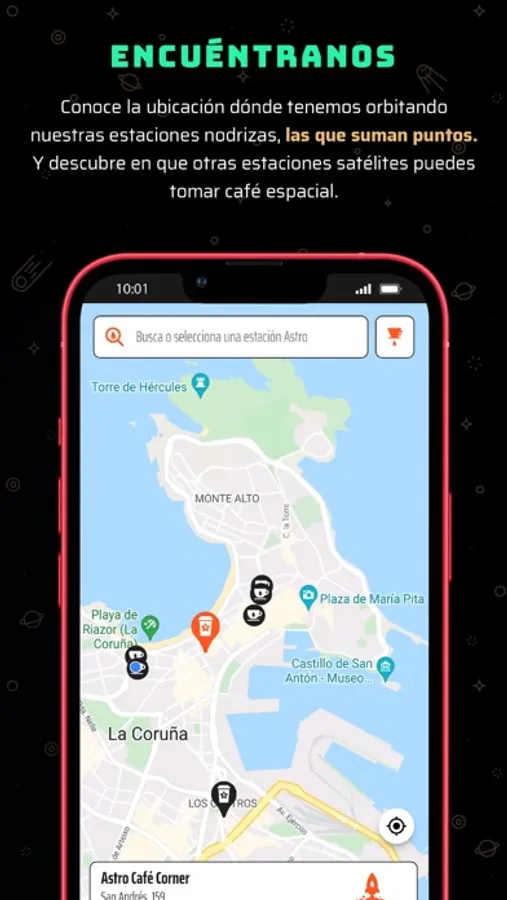 Con nuestra nueva app acumularás puntos que podrás canjear por recompensas; estas podrían ser limitadas, recomendaciones según la estación o simplemente tu café favorito. Además según vayas sumando puntos subirás de rango en nuestra flota y podrás beneficiarte de descuentos exclusivos y alguna que otra sorpresa. También podrás consultar tus compras y conocer la ubicación exacta de nuestras estaciones.