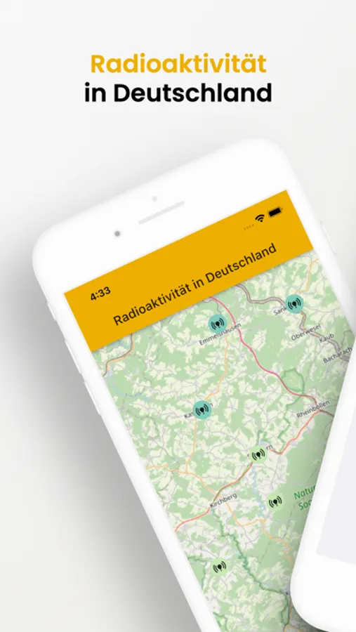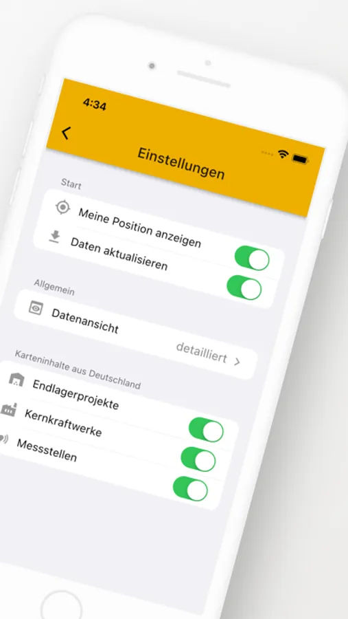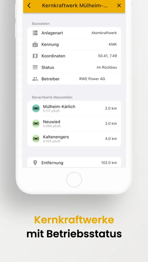 In der Kartendarstellung sind verschiedene Elemente sichtbar, welche über die Einstellungen ein- und ausgeblendet werden können. So sieht man neben den Messstellen z.B. Kernkraftwerke und verschiedene Informationen hierzu. Durch antippen der Koordinaten wird die Standard-Karten-App an der entsprechenden Position geöffnet.