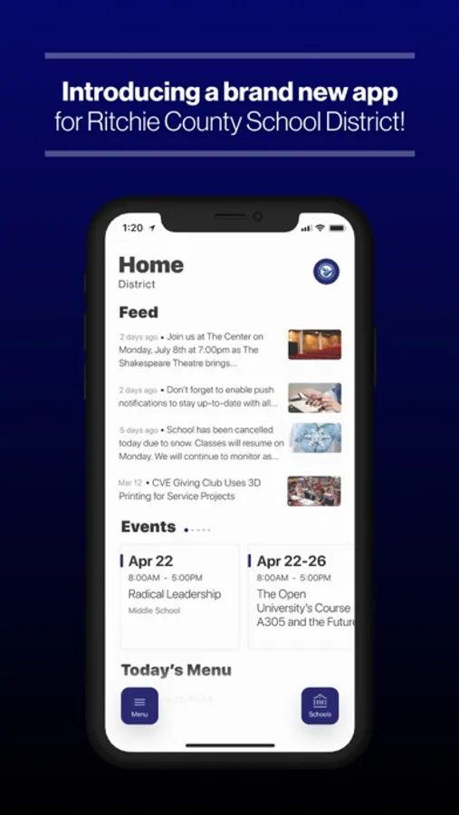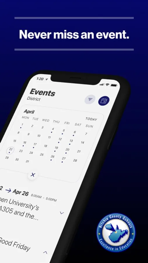The event section shows a list of events throughout the district. Users can add an event to their calendar to share the event with friends and family with one tap.
