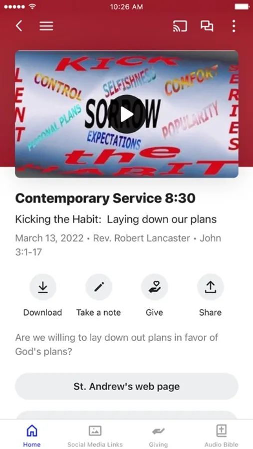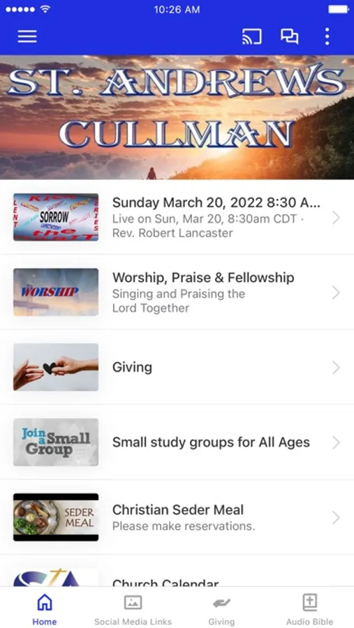St. Andrew's Cullman AL. We invite you to download our app and join us for Bible Studies and Worship Services. You can see what special events are coming up on the Calendar. You can view previous sermons, find out the name of the current Sermon Series, check out small groups and register for special events ahead of time. We would love to have you be our guest on Sunday mornings at 8:30 or 11:00. You can even register your children for the nursery or children's church. We hope you will download our app and be our Guest worshiping God. We are the home of the imperfect searching and growing together in Christ.