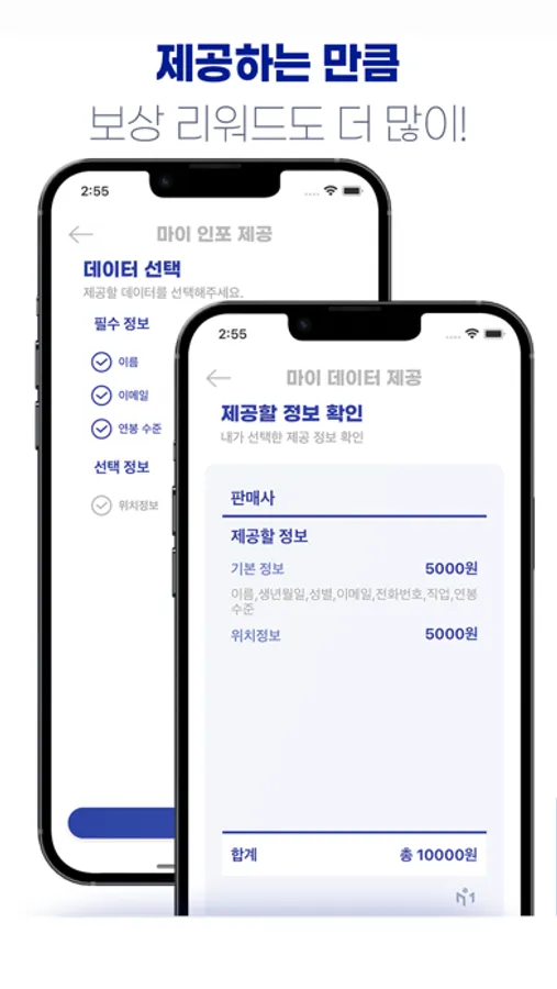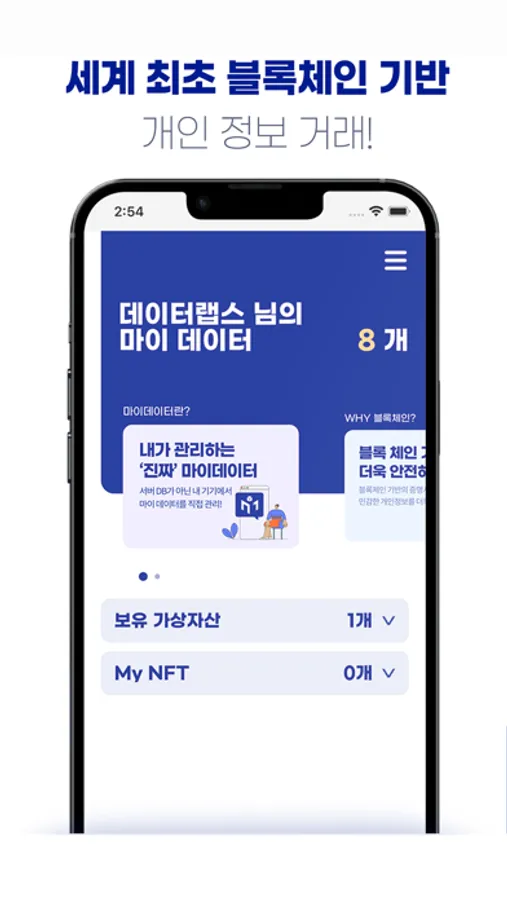 마이인포마켓은 세계 최초의 블록체인 기반 개인데이터 마켓 플랫폼입니다. 자신의 데이터를 블록체인 기반으로 운영 및 거래를 주도적으로 하며 그에 따른 보상이 주어집니다. 블록체인에 해시값만 저장하여, 중앙서버 DB에 저장하는 기존 시스템보다 개인정보보호가 강화됩니다.