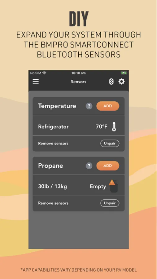 BMPRO Connect powered by BMPRO on board your RV is flexible and scalable – it is easy to add features and sensors to expand your system through the addition of SmartConnect Bluetooth sensors. Available through RV Dealerships, SmartConnect sensors enable you to monitor propane levels, tire pressure and internal temperatures. The SmartConnect sensors are a DIY installation.
