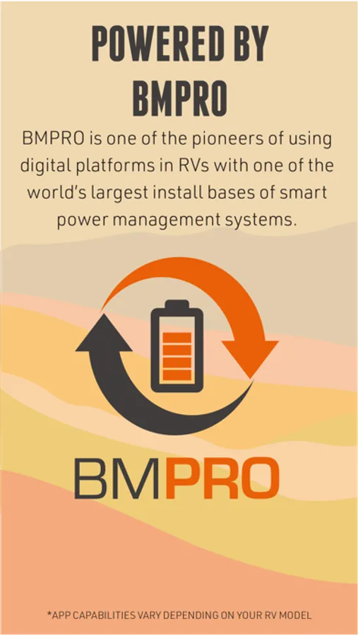 BMPRO Connect powered by BMPRO is an RV control and monitoring system for easy management of RV features via an app on your own device. It is specifically designed to work with the North American RVs – check your RV specifications to ensure your vehicle is compatible with this app.