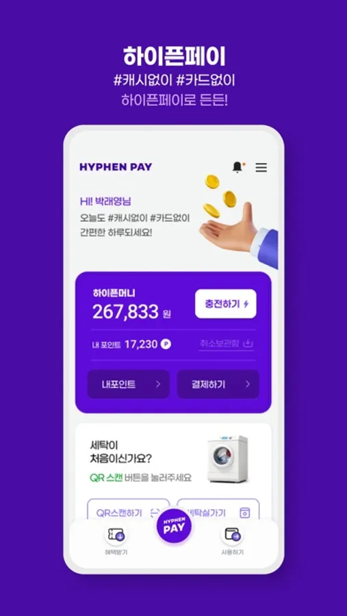 현금이 없을 때에도 하이픈페이 앱으로 편리하게 결제하고 세탁하세요