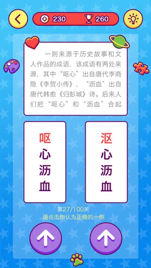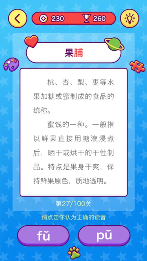 猜字大挑战,包括容易读错的读音和容易认错的汉字。中华文化博大精深,其中汉子成语尤其重要,这个游戏就是提醒我们读正确的读音,用正确的汉子。