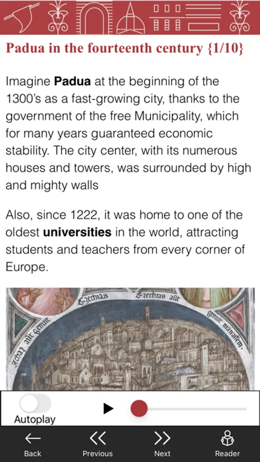 Each place is told through 10 contents: the texts are accompanied by reference images. You can choose to read and/or listen to the audio contents, also in Autoplay mode. If something is unclear to you, resort to the glossary!