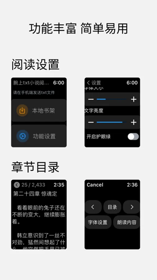 您需要先准备好txt文本文件,在手机上完成章节切割操作,然后发送到手表上进行阅读。