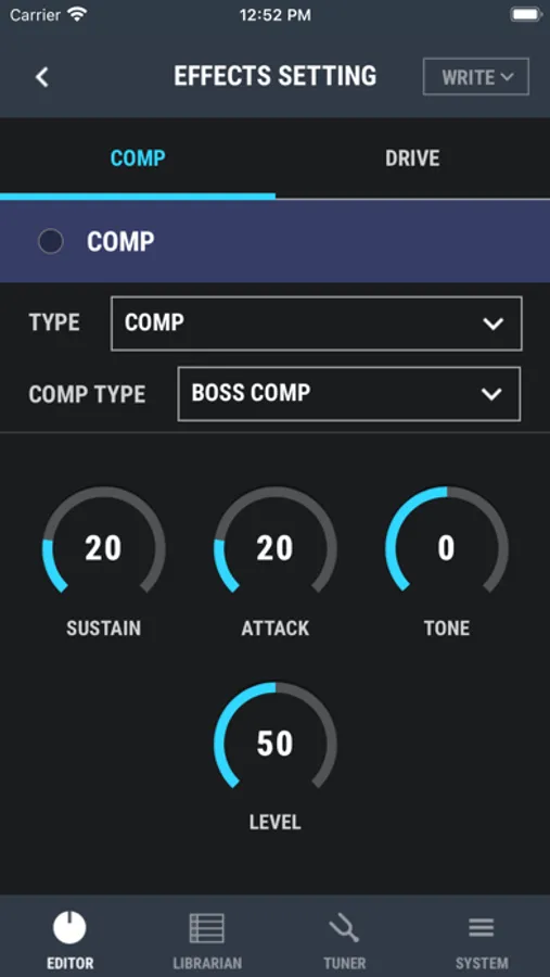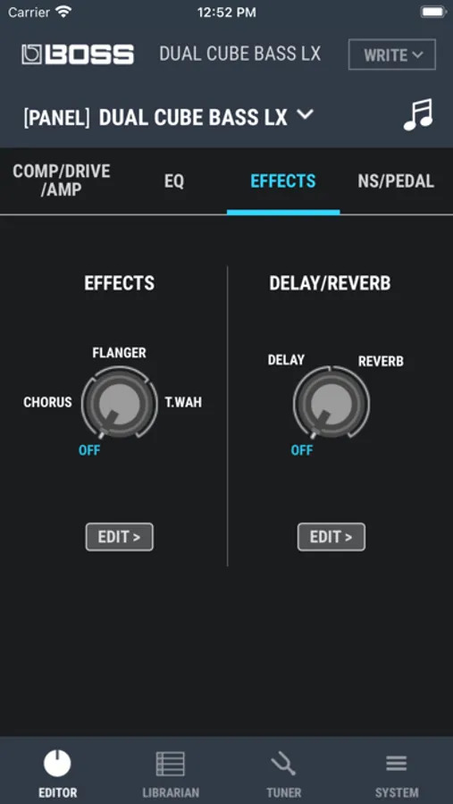 Dedicated editor for controlling functions on the BOSS DUAL CUBE BASS LX Bass Amplifier.