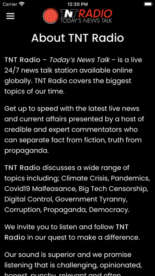 TNT Radio – Today’s News Talk – is a live 24/7 talk back news station available online globally. TNT Radio covers the biggest topics of our time. Get up to speed with the latest news, current affairs, live radio and videos presented by a host of credible and expert commentators.