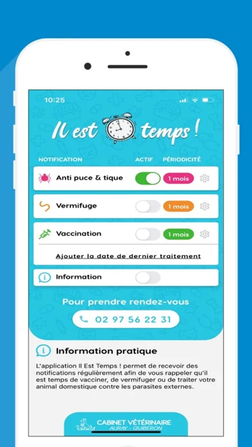 - Recevoir une notification 1 mois, 2 mois, 3 mois... après la date de dernière prise, afin de ne pas oublier de traiter son animal,