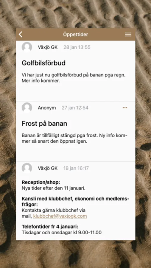 Med appen för Växjö GK kan du som medlem få tillgång till viktig information via pushnotiser. Du kan följa vad som händer på klubben via nyhetsflöden, boka tid för golf, läsa mer om våra banor, ta del av information från vår shop och mycket mer.