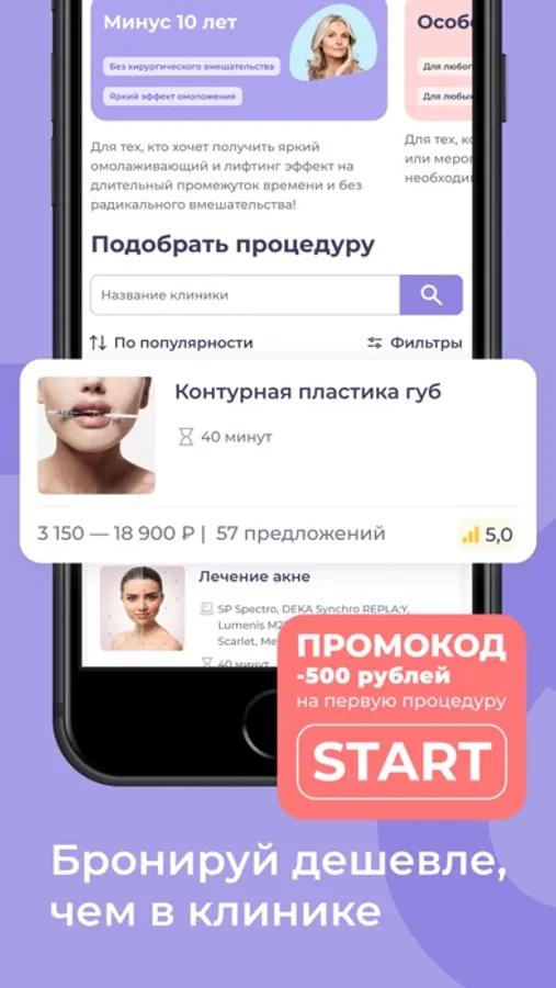 Выбор и бронирование процедуры напрямую у клиник, без посредников.