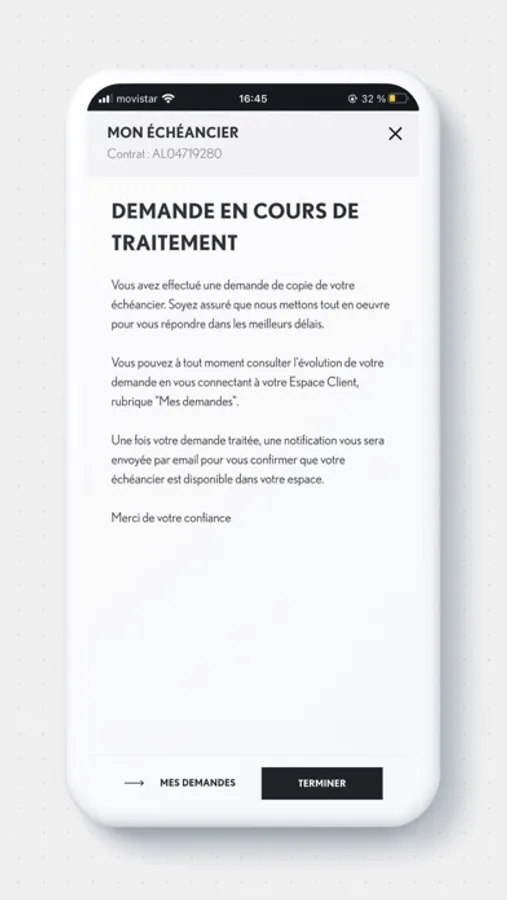 Retrouvez en temps réel le suivi du traitement de vos demandes ainsi que tous vos documents. Nous vous répondons 24h/24 7j/7 !