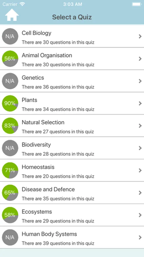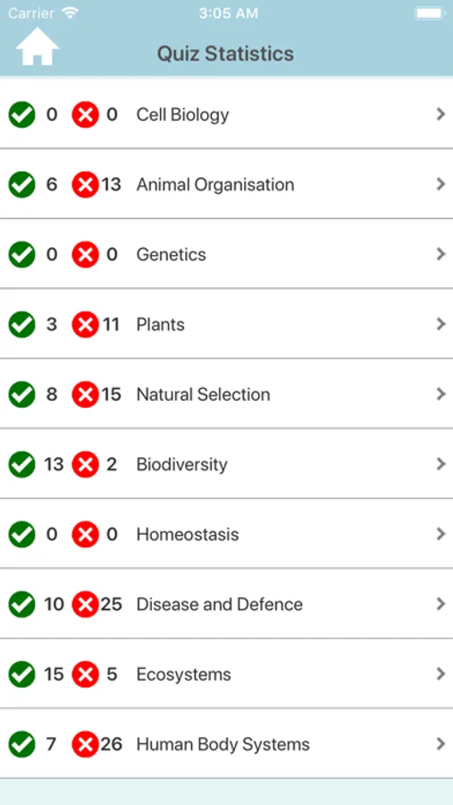 - You can review a quiz session performance details by selected a session. This screen shows quiz history performance reports.