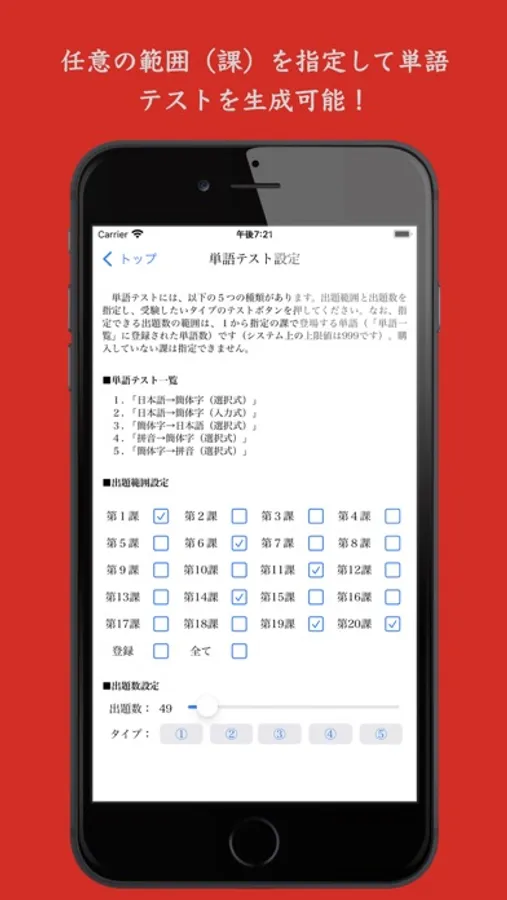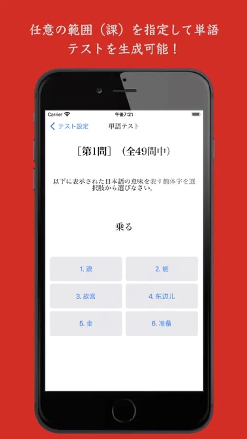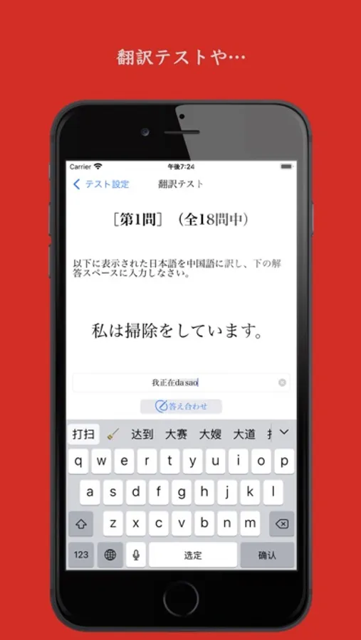 語学では単語が命です。でも単語カードを作ったり…なんてことはしたくないですよね。単語テストでは、「簡体字→日本語」、「簡体字→拼音」など計5種類の出題パターンを全て演習可能です。片手間でできるため、移動など隙間時間に活用できます。