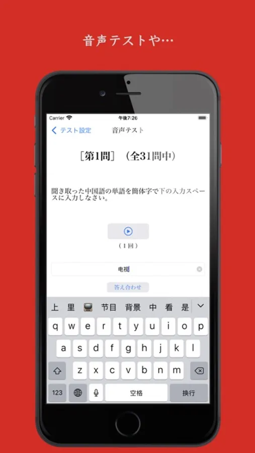 聞き取りは中国語履修者の悩みの種の一つです。紛らわしい音が多数あるため、耳を慣らすしかありません。音声テストでは、読み上げられた単語を入力する問題や、本文に関する質問に中国語で回答する問題など計3種類の出題パターン全て演習可能です。