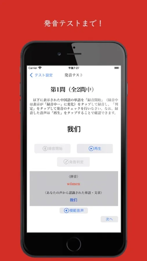 中国語では発音も重要です。本文の朗読などの試験も課されることがあるため、対策は必須です。発音テストでは、表示された単語や文章を読み上げ、録音することで、アプリがその正確性を判定します。