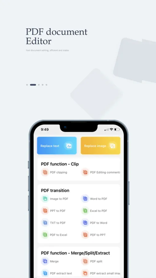 PDF replace text/picture Select a document, press and hold to select a framed one to edit text/replace and delete pictures