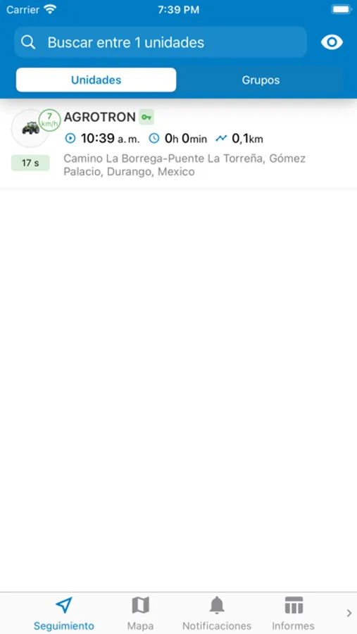 - Modo de mapa. Acceda a unidades, geocercas, recorridos y marcadores de eventos en el mapa con la posibilidad de determinar la localización de su dispositivo móvil.