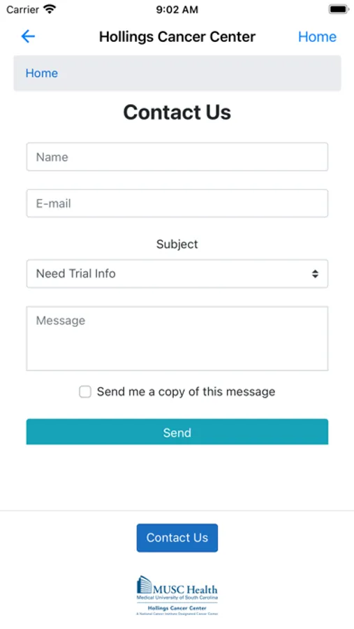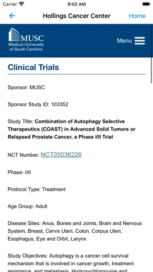 This application is designed for health professionals seeking clinical trial opportunities for cancer treatments opened at the Medical University of South Carolina (MUSC) Hollings Cancer Center (HCC) or at any cancer center within the MUSC NCI Community Oncology Research Program for Minority and Underserved (NCORP-MU). Clinical trials are research studies looking at novel therapies that are considered investigational.