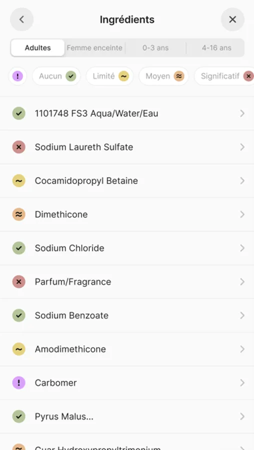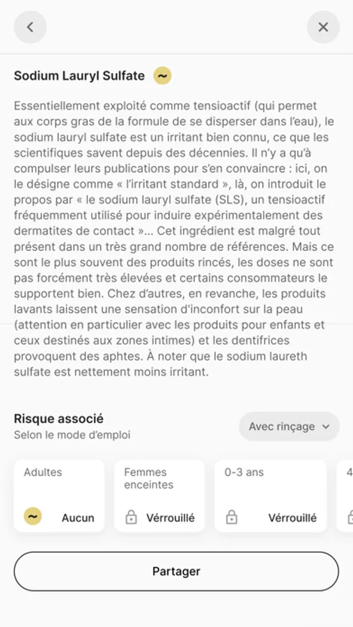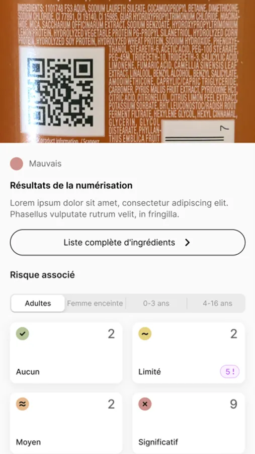 - Numérisez la liste d’ingrédients qui composent les produits cosmétiques pour en apprendre plus sur les risques associés à ces ingrédients selon l’utilisation des produits.
