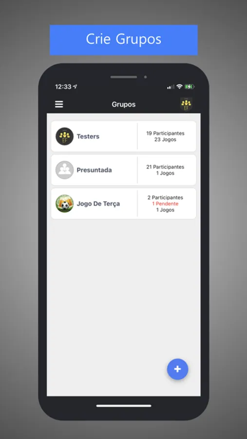-Crie grupos para organizar suas partidas, como um app de mensagens.