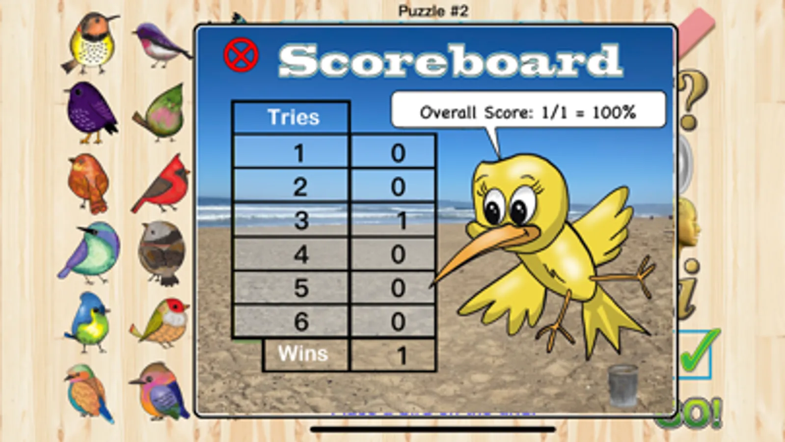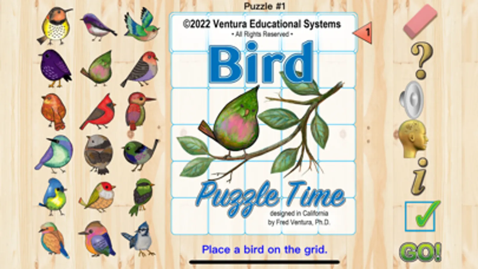 The object of Bird Puzzle Time is to use deductive reasoning to find the mystery set of birds. Begin by placing any of the 18 whimsical birds on the top row. Use the feedback given to figure out the mystery set of birds. Orange means the bird is correct but it is not in the right place. Green means that the bird is correct and it is in the right place. Use logical thinking to determine the mystery set of birds and the correct positions.