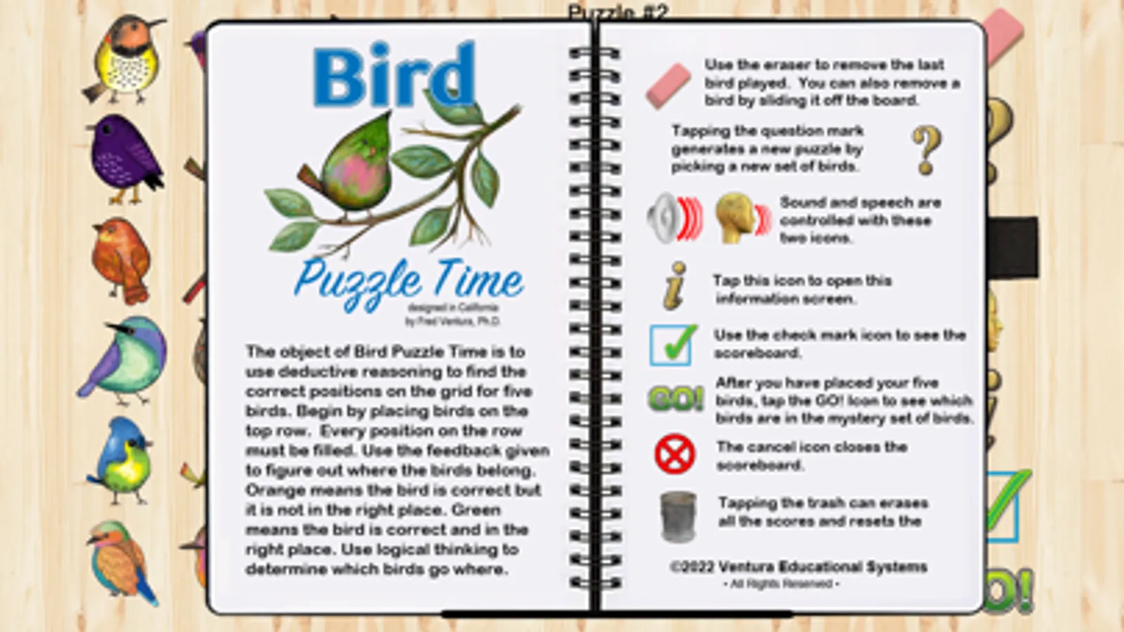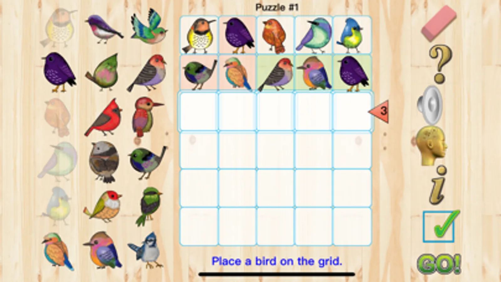 Bird Puzzle Time is available for iPhone and iPad. On either device the object of Bird Puzzle Time is to use deductive reasoning to find the correct positions on the grid for five birds. Begin by placing birds on the top row. Every position on the row must be filled. Use the feedback given to figure out where the birds belong. Orange means the bird is correct but it is not in the right place. Green means the bird is correct and in the right place. Use logical thinking to determine which birds go where.