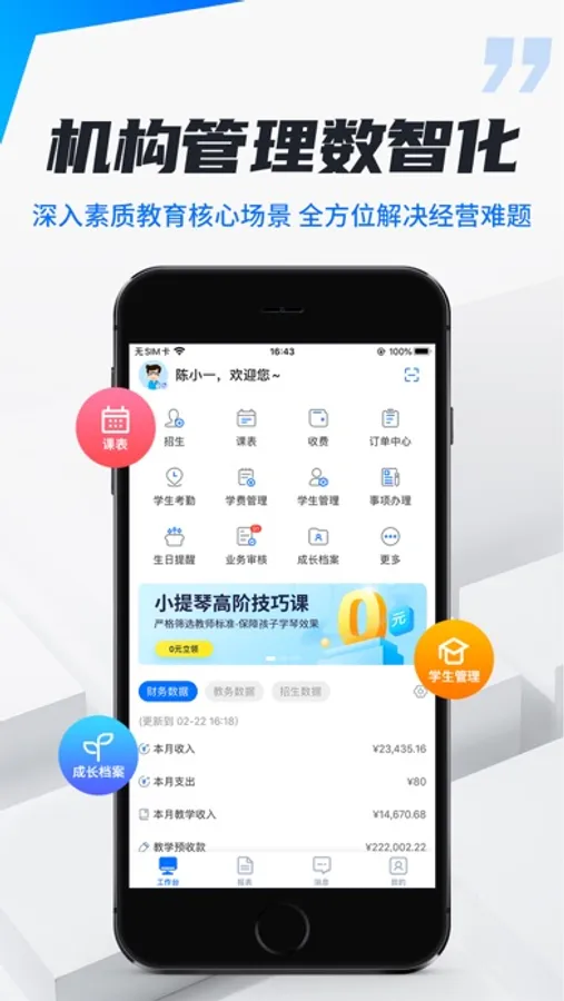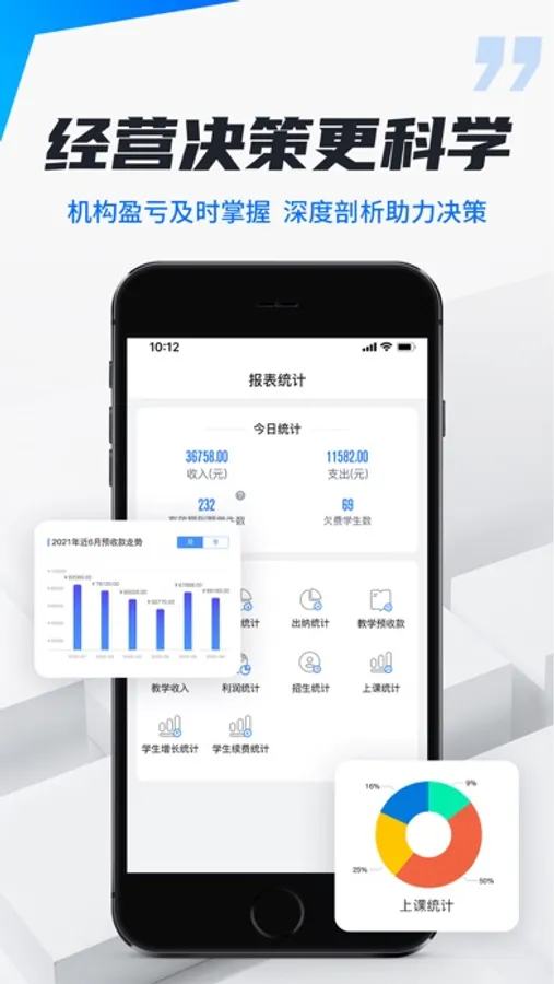 运营数据:机构当下盈利能力一目了然,支持查看收入构成及成本明细,助力机构开源节流。