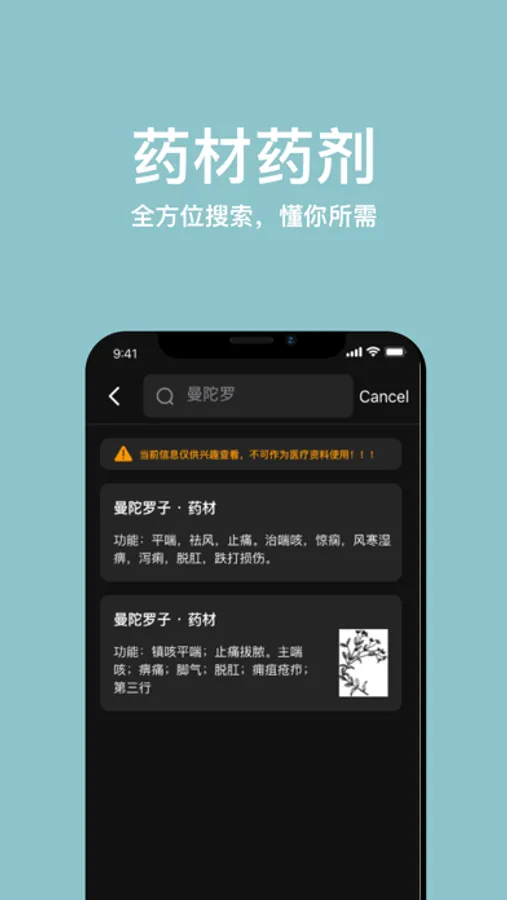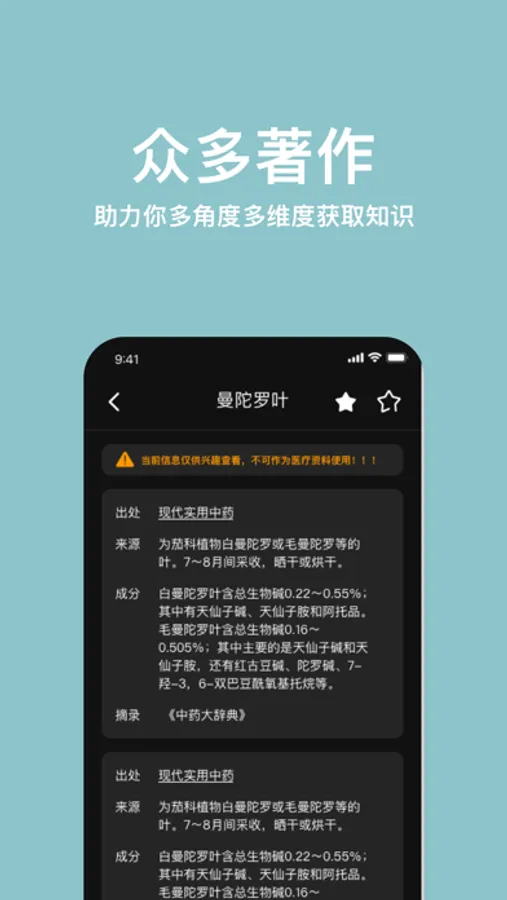 中药药典App 汇集了18790种中草药,60661种药方药剂,1201种医学著作。