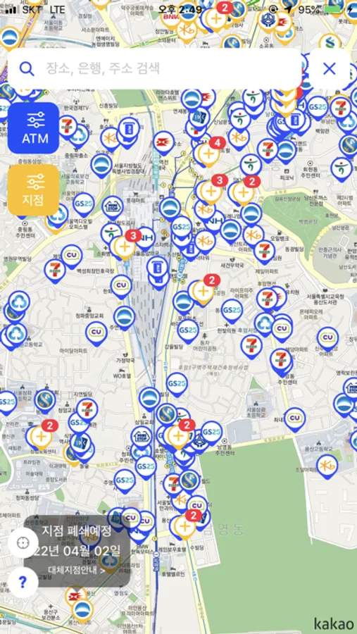 - 장소, 은행명, 주소로 검색하면 관련 금융회사(은행 등)의 ATM/지점을 조회할 수 있습니다.