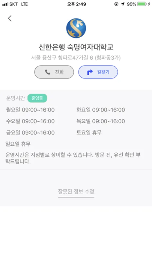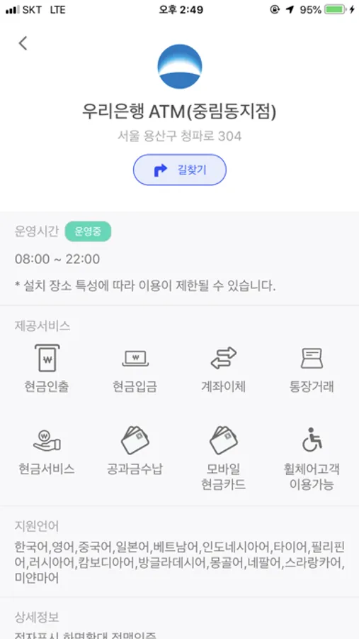 - 전화걸기·길찾기 기능을 제공하며, 운영시간·제휴은행·휠체어가능여부 등도 조회됩니다.