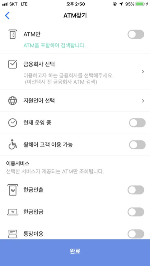 - 메인화면에서 지점없이 ATM만 조회할 수 있으며, 특정 금융회사·운영여부·휠체어가능여부·이용서비스 등의 설정값에 따라 조회할 수 있습니다.