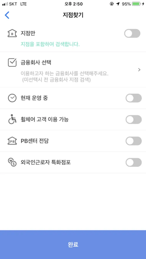 - 메인화면에서 ATM없이 지점만 조회할 수 있으며, 특정 금융회사·운영여부·휠체어가능여부 등의 설정값에 따라 조회할 수 있습니다.