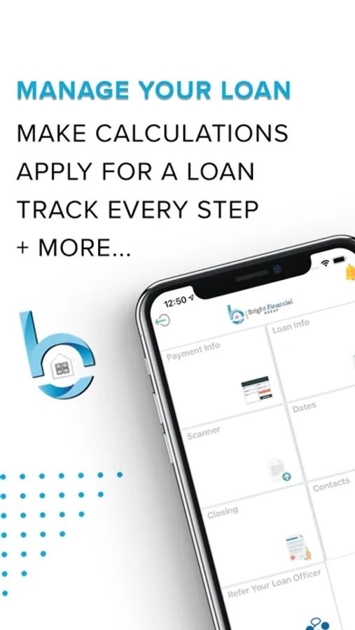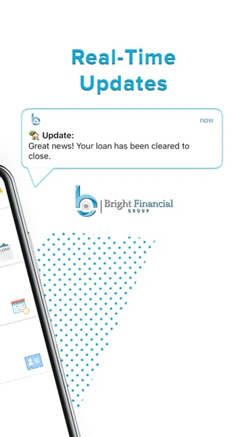 The Bright Financial Group mobile app allows consumers, real estate agents, and loan officers to track their loans, receive real-time updates and submit conditions via their mobile device. Users are able to verify loan information and status, receive push notification reminders for important dates (appraisal, loan commitment, closing, rate lock etc.), initiate a chat and remain engaged from origination to close.
