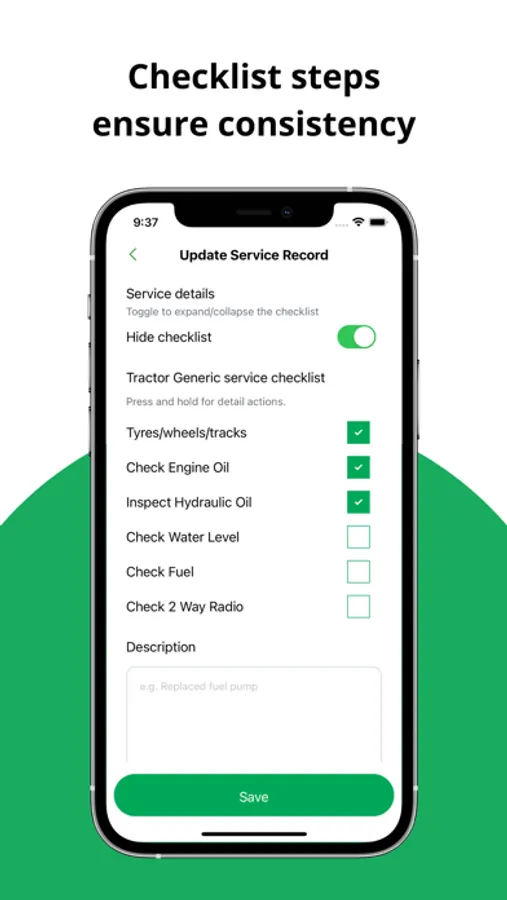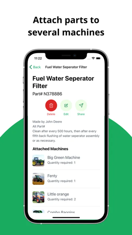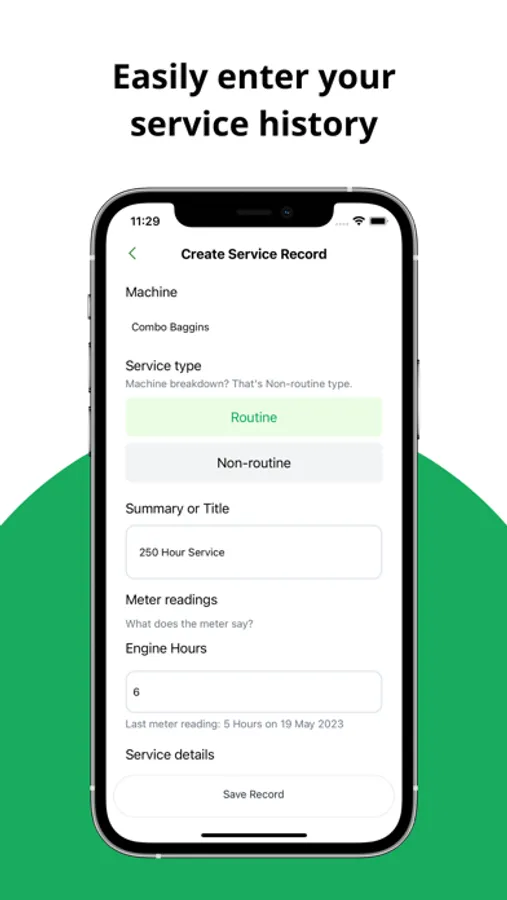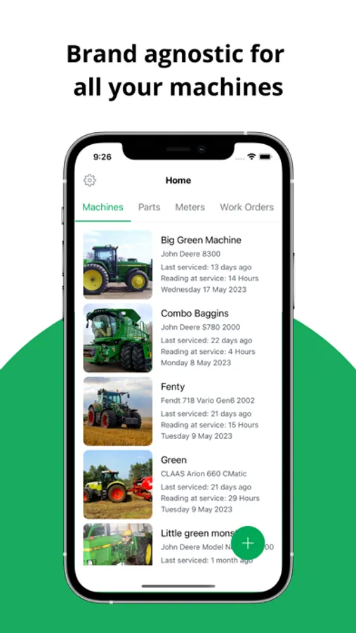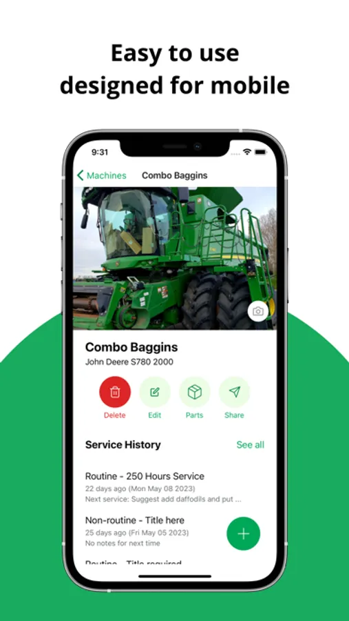 Operate safely, preserve resale value, and maximise uptime. A quick look at your phone will see the maintenance performed and the meter readings for your machines. No looking for pieces of paper in the workshop, relying on your memory, or worse, someone else's.