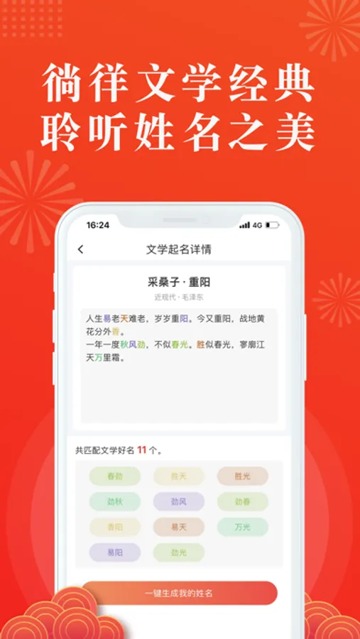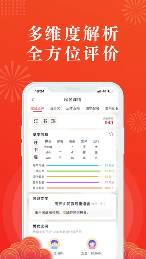 传统取名学讲究名字需与个人生辰八字相匹配,文学起名能准确推算出个人八字五行的强弱属性,为用户取名提供一个全面的思考方向,挑选出满意的名字。