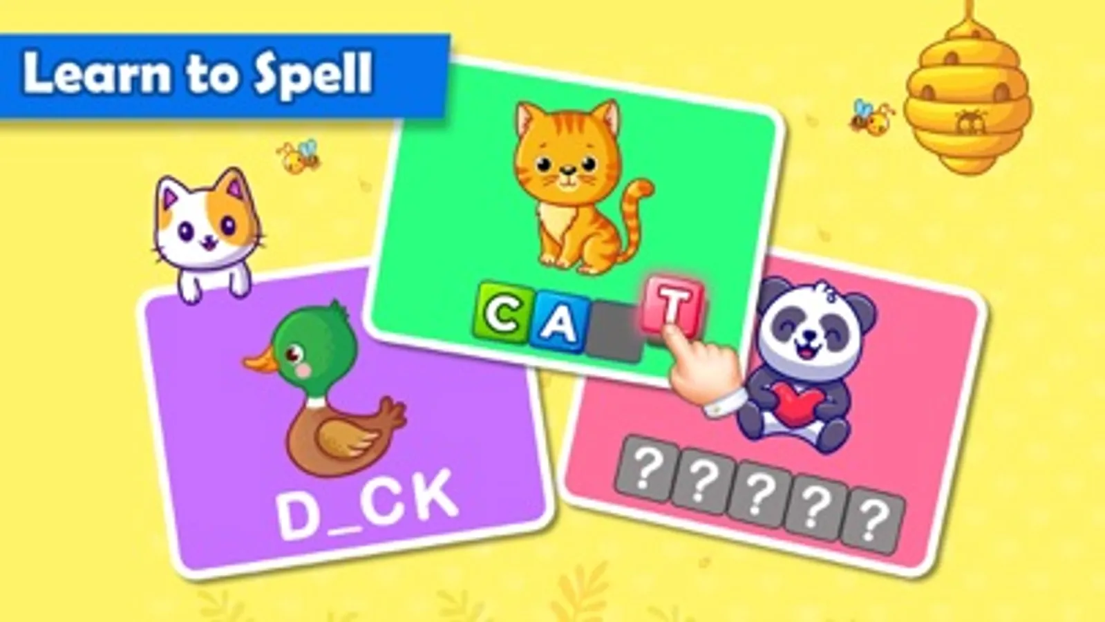 Spelling : Kids' learning games act as brain trainers & draw their attention to practice the spellings of Alphabets, Numbers (123), Colors, Animal names, Fruits, and Shapes and improve kids' memory skills.