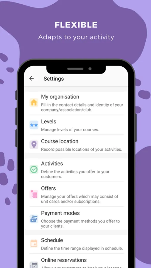 - Customize your activity. Ex: level of courses, places, activities, commercial offers, management of memberships...