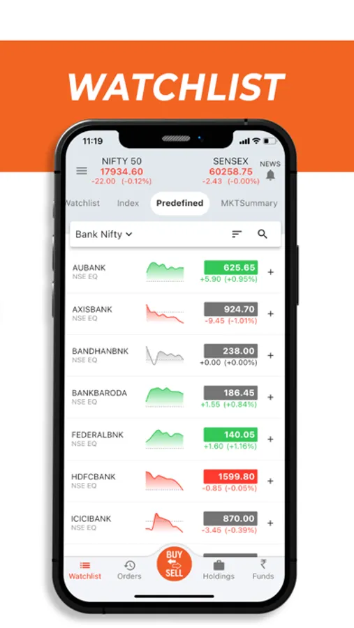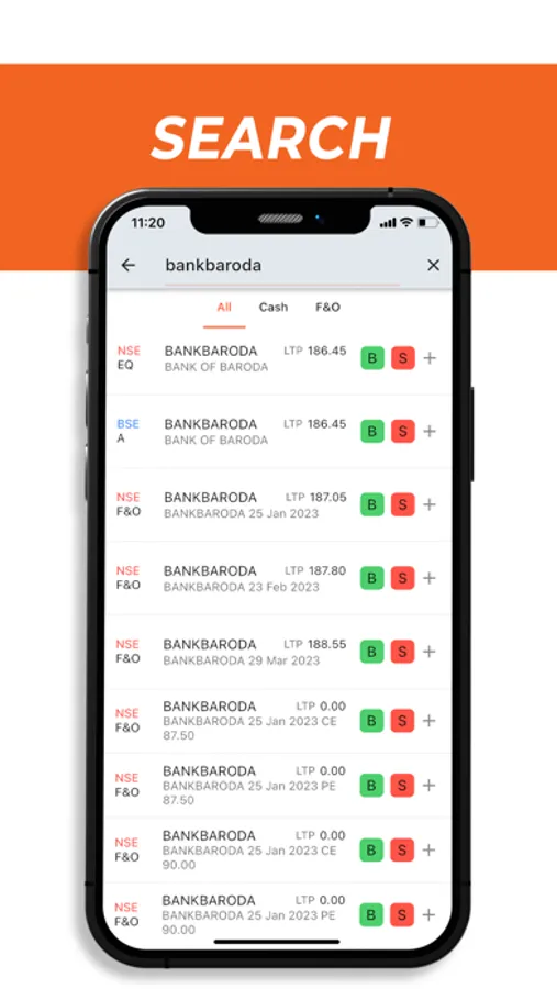 To BUY / SELL the desired stocks just simply click on BUY / SELL option given at the footer. Search the stocks and click on B or S to BUY / SELL. By clicking on plus button, you can add the stocks in Watchlist.