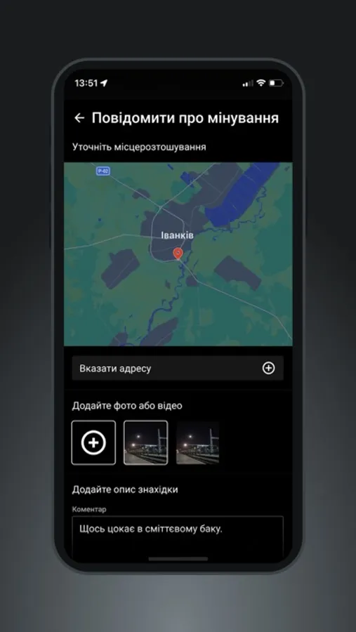 - у декілька кліків направити повідомлення про виявлені вибухонебезпечні та підозрілі предмети та відстежувати його статус.