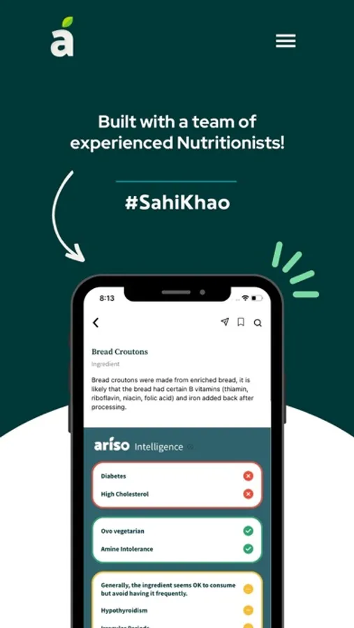 Ariso is India’s first food transparency and personal nutrition platform. If you’ve ever questioned the quality or the nutritional value of the food you’re eating then we have got you covered. “Can I eat this?”, and “Is this good for my health?” are some questions that Ariso can answer with great accuracy. Along with giving you recommendations, Ariso can also help you understand foods, diets and nutritional concepts with the help of easy-to-understand articles and blogs. We pride ourselves on the fact that we are the voice of truth and as a result, everything we show is extremely unbiased and vetted by a team of nutritionists.