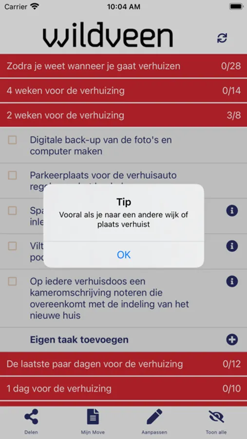 Met onze verhuisapp weet je namelijk tijdens alle fases van je verhuizing wat je moet doen en kun je zelf ook taken toevoegen, naast de handige taken en aandachtspunten die de app al voor je aangemaakt heeft, waaronder: