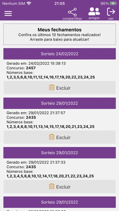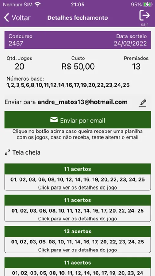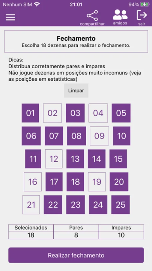O app também fornece a possibilidade de gerar fechamentos para lotofácil, com conferência automática.