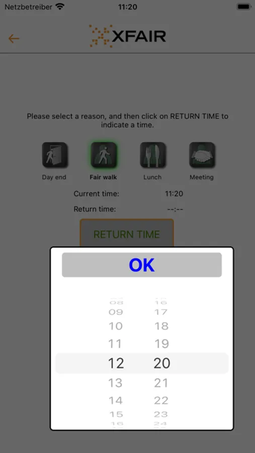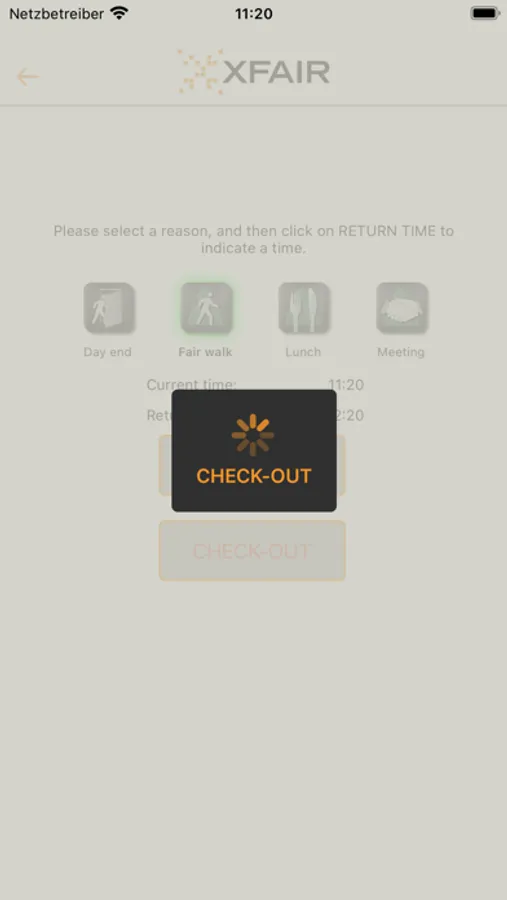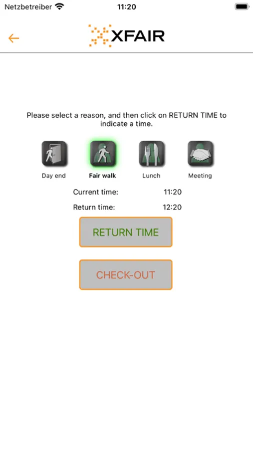XFAIR.check-in allows a person to set their attendance status in real time in our EMS (Event Management System) during a trade fair or event. This means that the service staff can see in EMS the attendance status of all persons at the trade fair or event. When using the app, a person can set their status and can also state a reason and return time when they are absent. By default, there are 4 reasons for absence available. However, these reasons can be modified. The app can only be used in conjunction with our EMS.