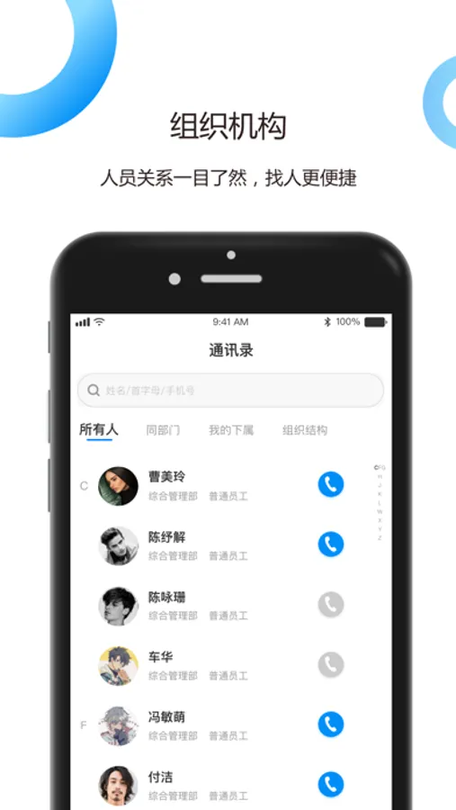 通讯录方便用户查询本单位或部门的联系电话。通讯录的类型为集团所有人、同部门、我的下属、组织机构四种类型进行分类。方便快速查询。