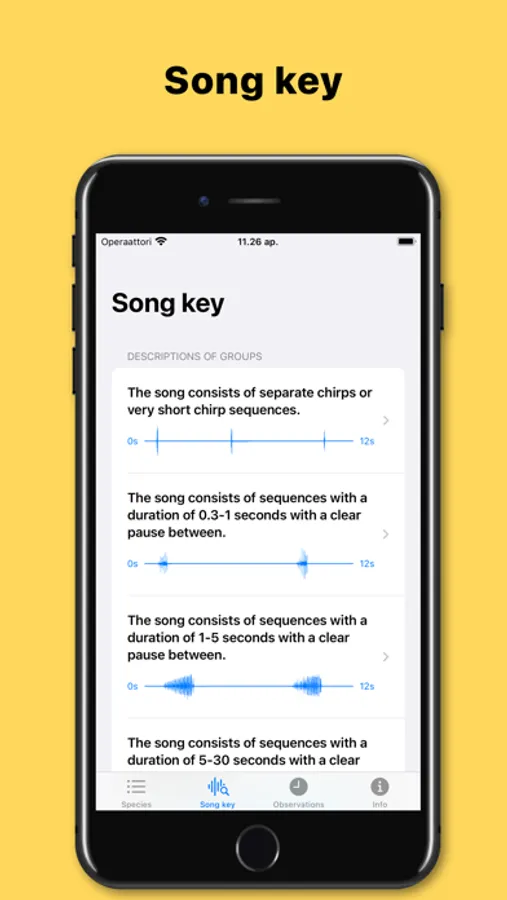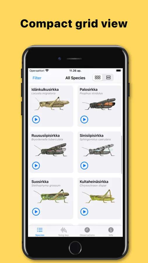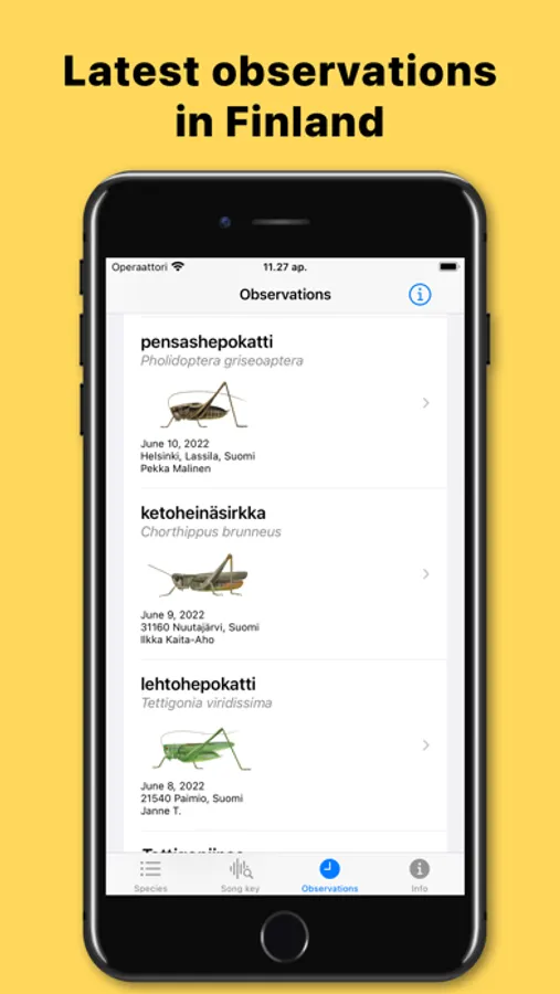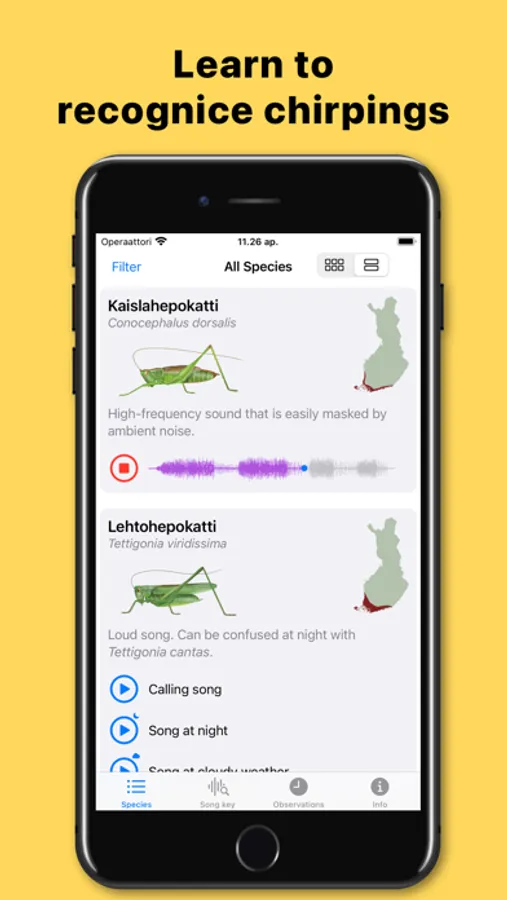 With the Chirping guide, the user learns to recognize the sounds of Finnish grasshoppers and bushcrickets. The sounds are recorded by non-fiction writer Sami Karjalainen, and most of the information content in the application also comes from him. Habitat, distribution and a detailed description of the vocalization is covered from each species.