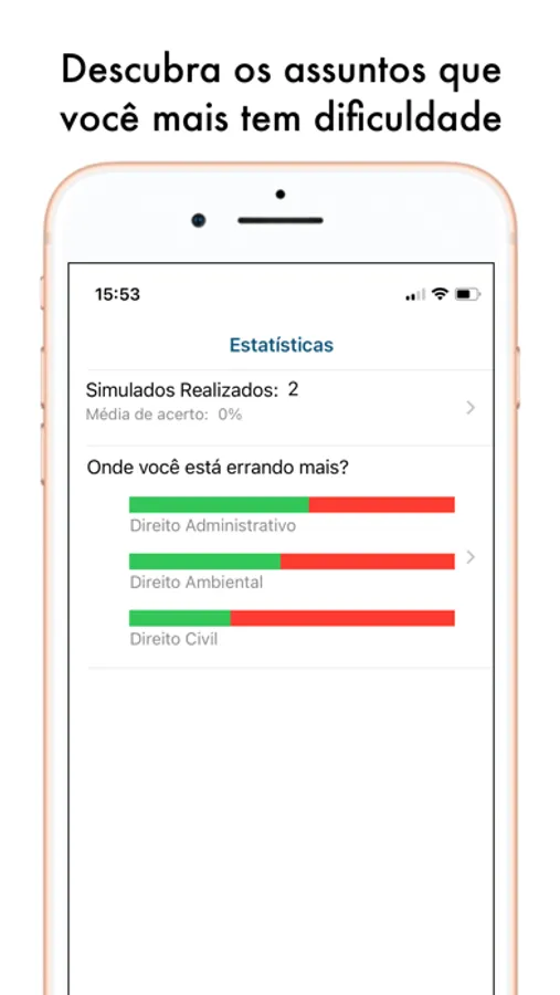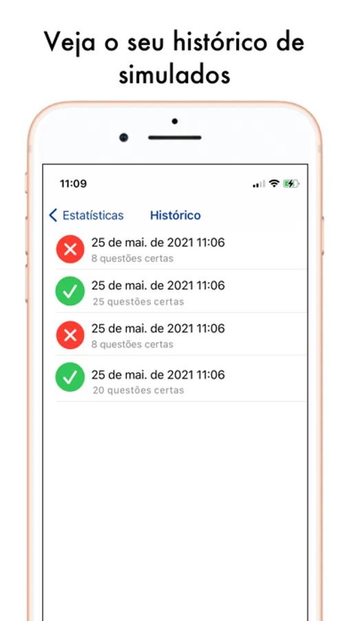 O app ainda conta com um histórico das provas que você realizou, para você acompanhar seu desempenho e mostra quais assuntos você está com mais dificuldade, assim você saberá exatamente o que estudar.