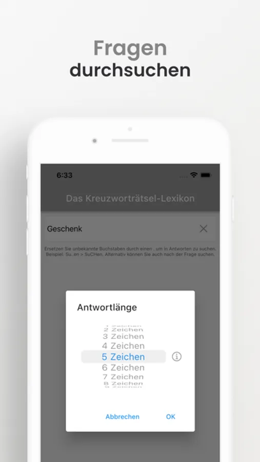 Alternativ können Sie auch direkt die Antworten durchsuchen, indem sie unbekannte Zeichen mit Punkten ersetzen. „SU..EN“ findet „SUCHEN“..