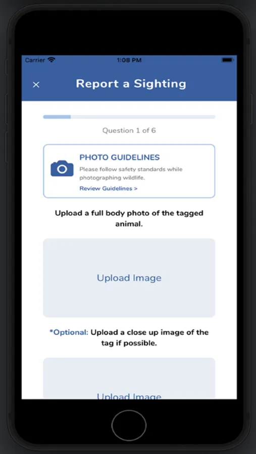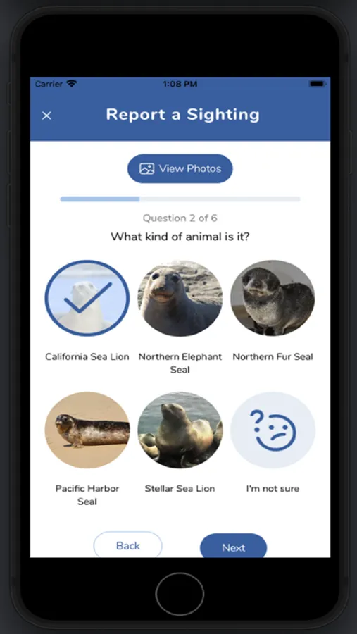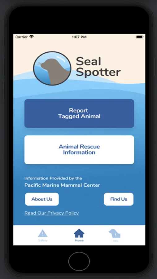 A citizen science tool which allows users to help marine mammal rescue centers track tagged seals and sea lions after they have been rehabilitated and released. Users upload photos of the tagged animal and fill out a report form to assist in this research effort. Users can also learn about the different species of seals and sea lions and understand how to safely observe marine mammals.